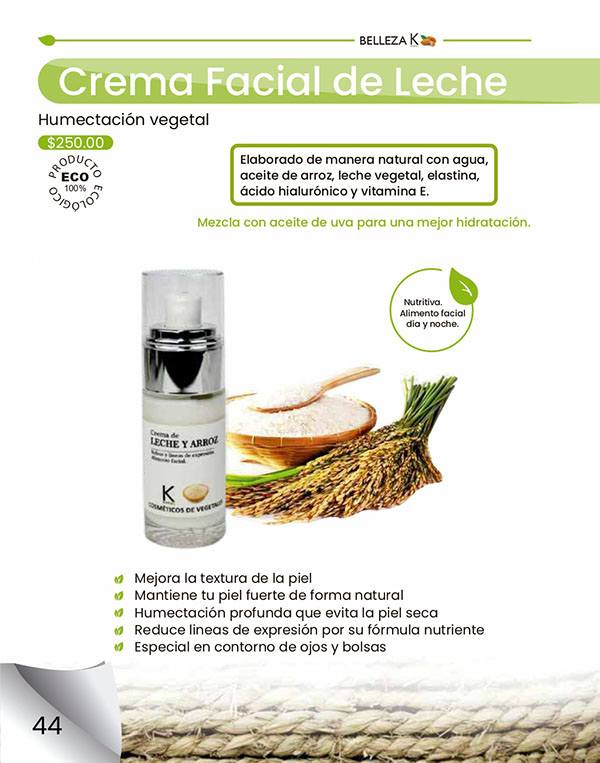 Elaborado de manera natural con agua, aceite de arroz, leche vegetal, elastina, ácido hialurónico y vitamina E.