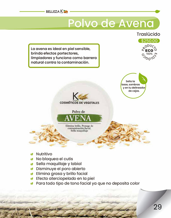 La avena es ideal en piel sensible, brinda efectos portectores, limpiadores y funciona como barrera natural contra la contaminación.